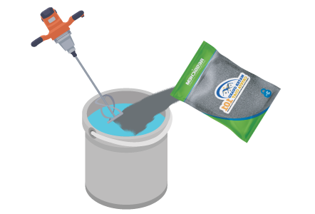 The Water powder ratio of Water Guard Crysta Coat is between 0.50 to 0.55. This means for a 2KG bag the water ratio can vary from 1 Ltr to 1.1 Ltr, and for a 20KG Bag 10 Liters to 11 Liters of water can be used. Only potable water is to be used for mixing. Always add powder to water, mix using a slow speed drill fitted with a paddle until a smooth lump free consistency is obtained. Do not rework stiff material by adding more water. Only mix enough material that can be used within 30 minutes.
